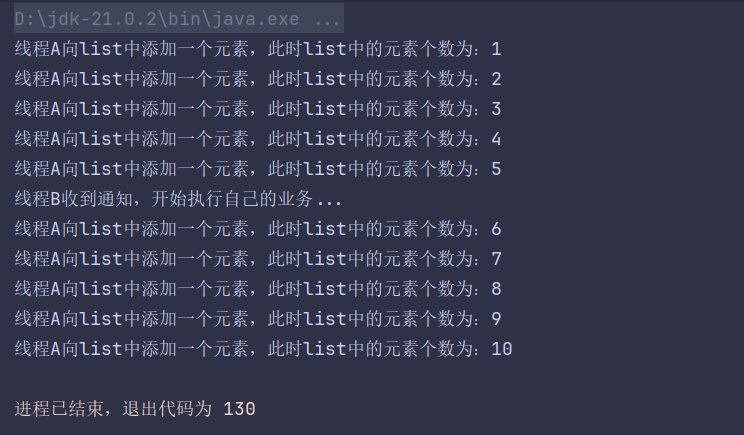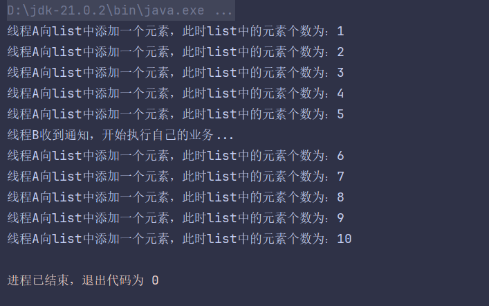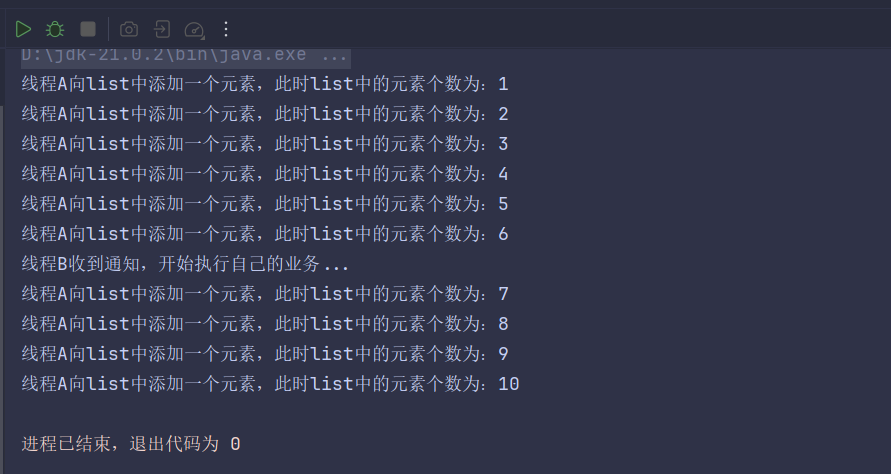 System.out.println("线程A向list中添加一个元素,此时list中的元素个数为:" + list.size());