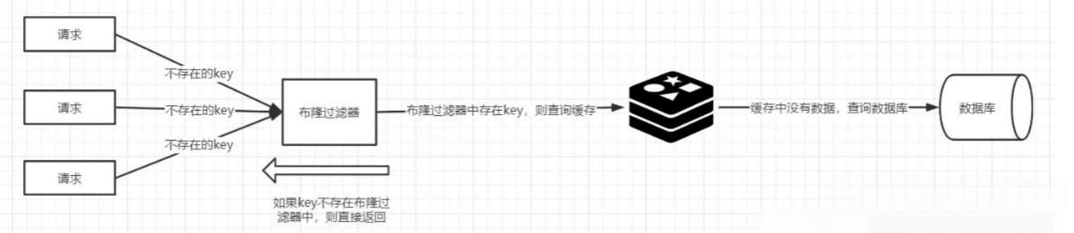 于是我们可以在缓存之前再加一个布隆过滤器,将数据库中的所有key都存储在布隆过滤器中,在查询Redis前先去布隆过滤器查询 key 是否存在,如果不存在就直接返回,不让其访问数据库,从而避免了对底层存储系统的查询压力。