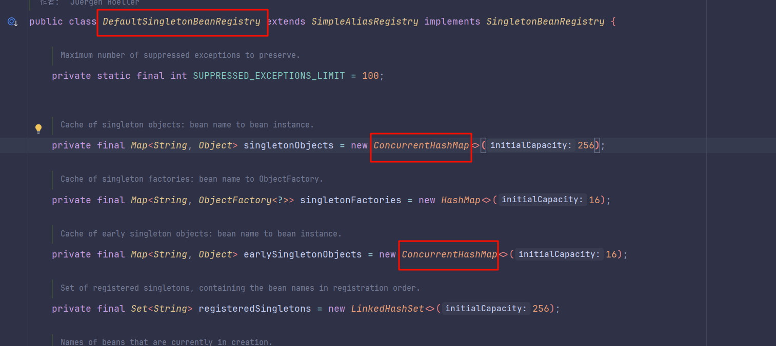 | earlySingletonObjects | 二级缓存,存放提前暴露的Bean,Bean 是不完整的,未完成属性注入和执行 init 方法。 |