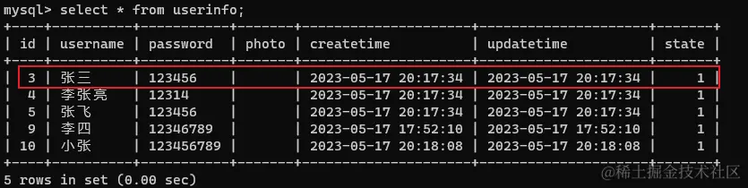 }无需手动开启事务和提交事务,进入方法时自动开启事务,方法执行完会自动提交事务,如果中途发生了没有处理的异常会自动回滚事务。 待删除数据的表,这里删除“张三”: