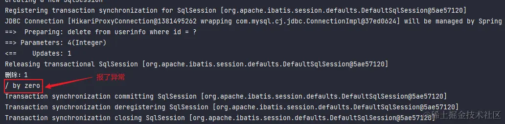 下面的代码会抛出异常,这时候再看看事务是否会回滚。