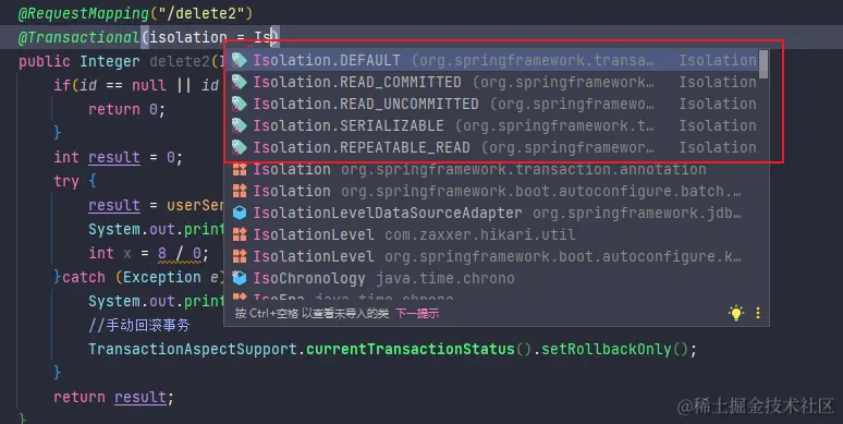 }可以看到处理了异常后,事务没有回滚,这样的操作非常的危险,但是也有解决的方法,那就是手动回滚事务: