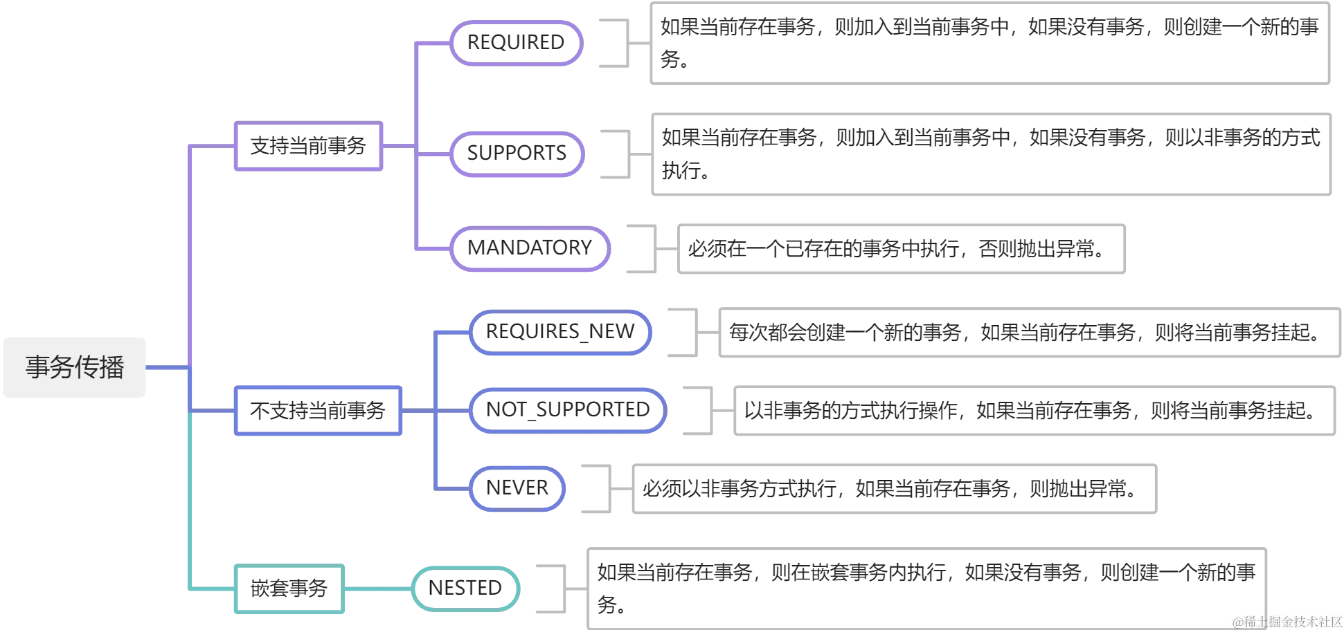 - NEVER:必须以非事务方式执行,如果当前存在事务,则抛出异常。