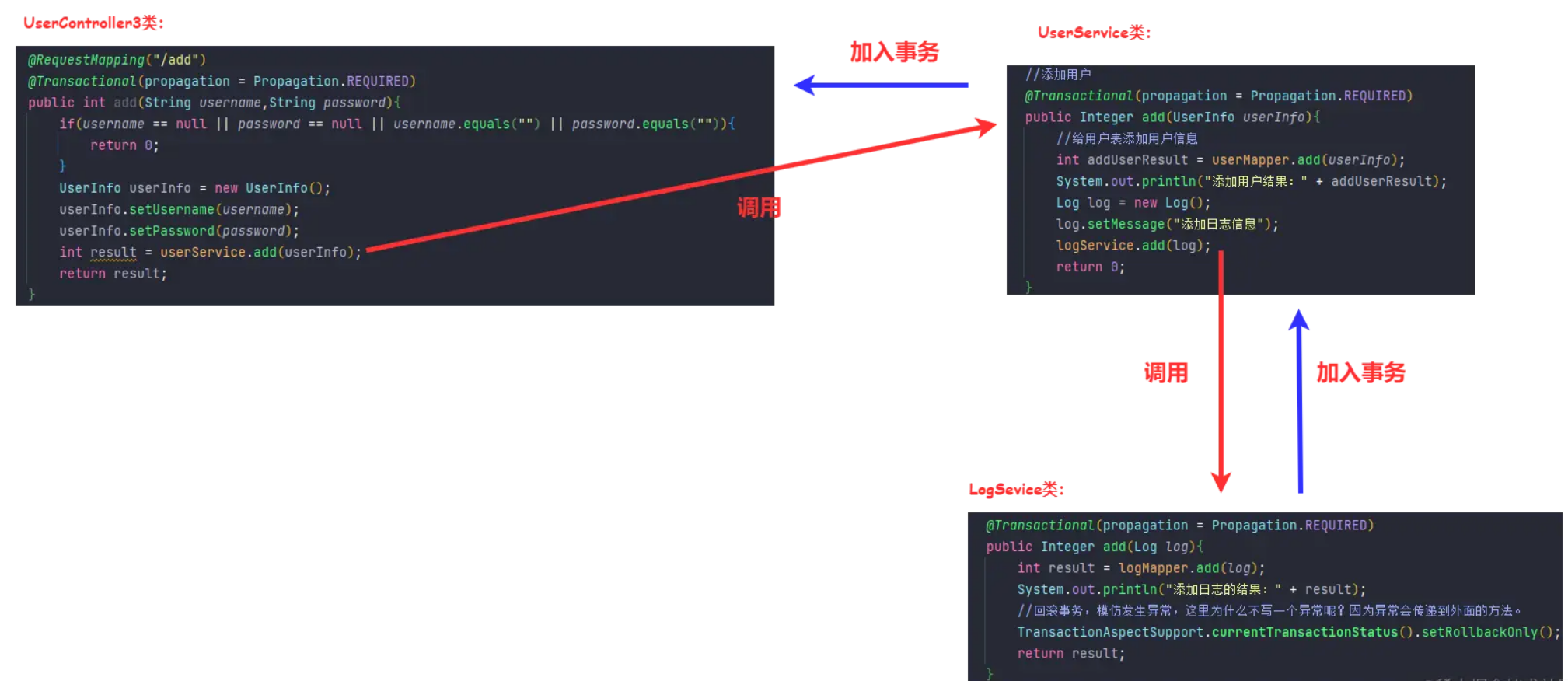 更具体的:LogService中的add方法本身有事务,UserService中的add方法也是REQUIRED。这时候,LogService中的add就加入了UserService中的事务,相当于一个整体。