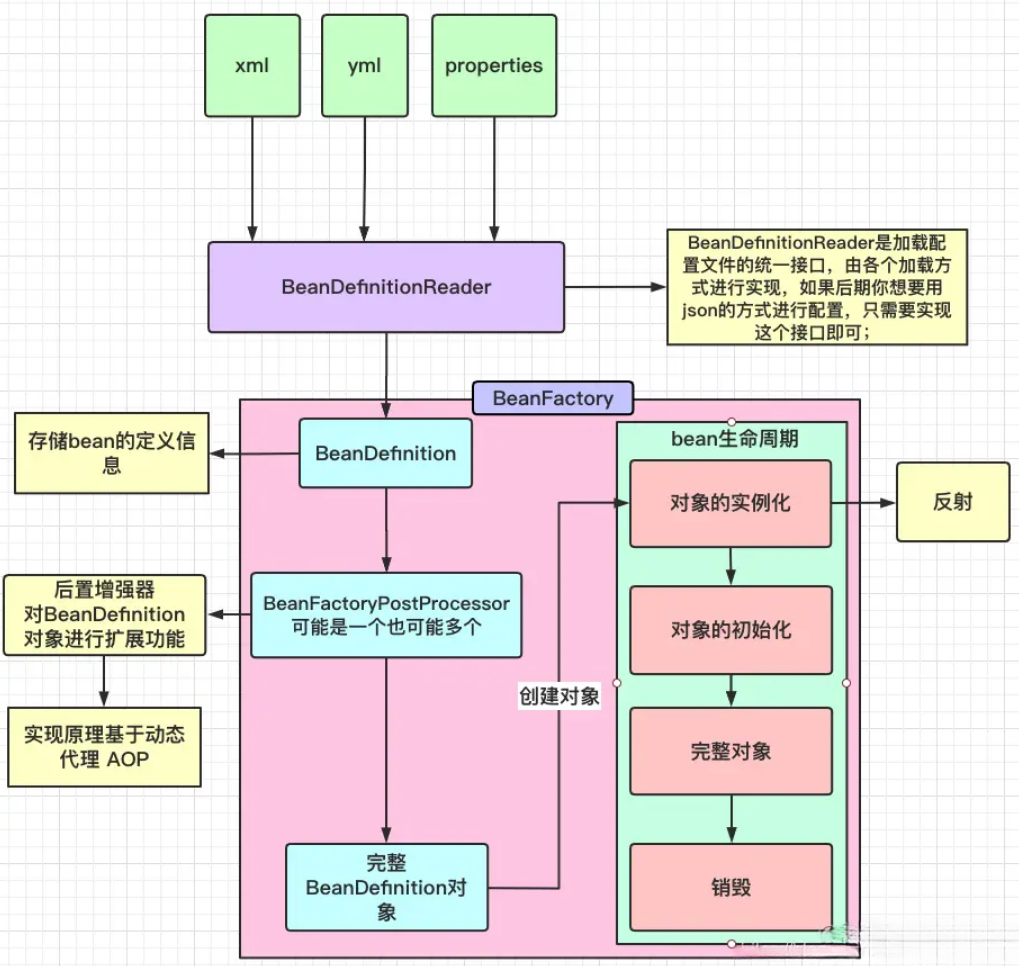 BeanDefinitionReader读取指定的配置文件生成bean的定义信息,然后到完整的bean定义信息(BeanDefinition对象),注意这里只是存储bean的定义信息,还没有实例化bean对象;就像工厂里面一样,原材料已经准备好了,但是还没有进行生产,原材料就是beanDefinition,生产就是实例化 - 在