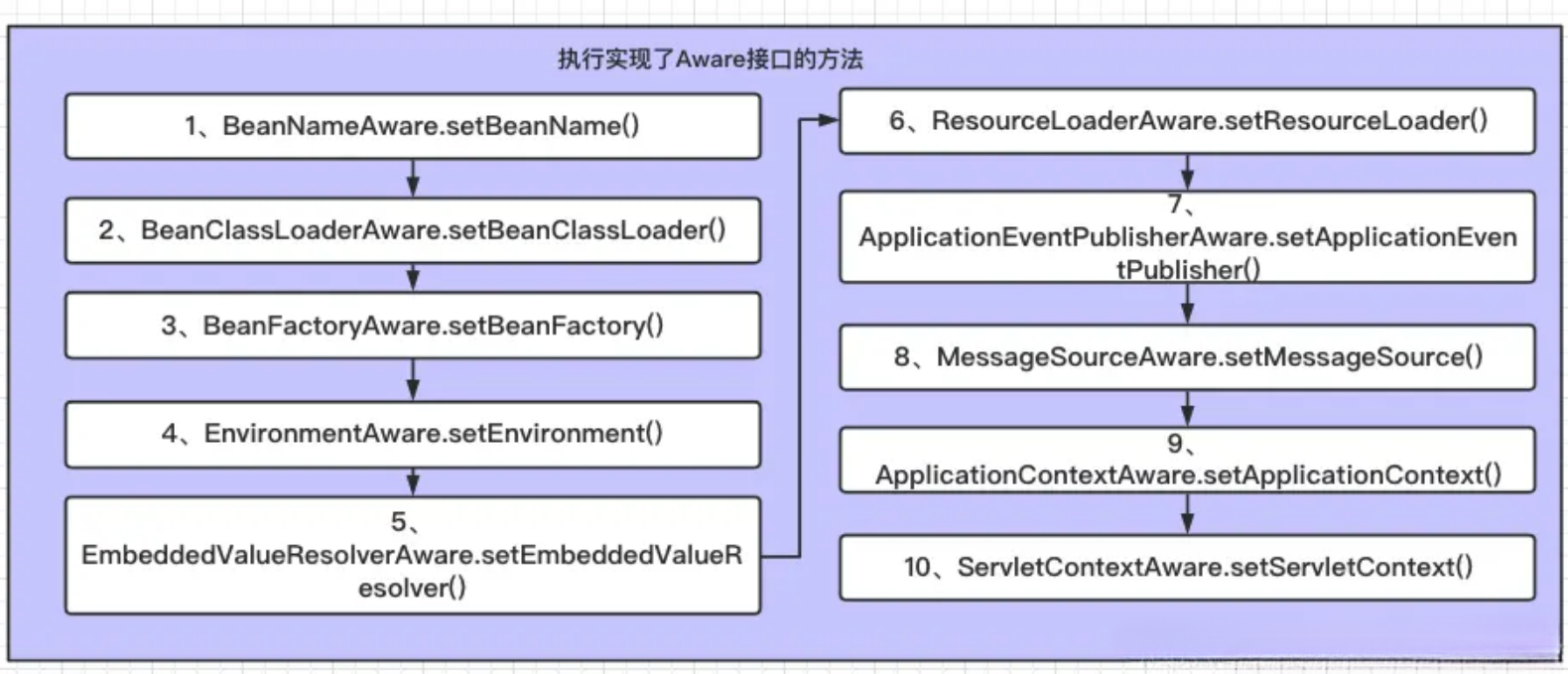 容器属性其实就是容器自带的属性,这些属性都是spring本来就有的;可以肯定的是,它们都是 Aware 接口的实现类,主要有以下实现类,我已经将它们的执行顺序都排列好了,