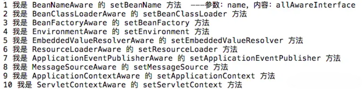 public class AllAwareInterface implements BeanNameAware, BeanClassLoaderAware,